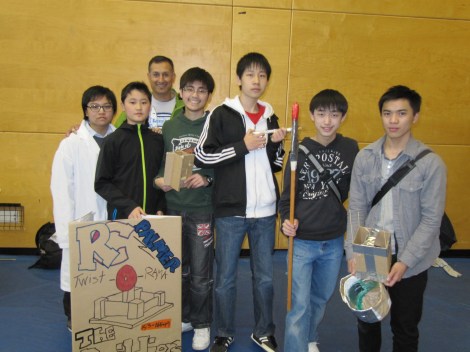 The Grade 9 team had to design and construct a light-weight structure that would hold as much weight as possible while withstanding a side impact after every certain number of weights placed (as well as performing a skit incorporating the testing of the structure) in the Structures challenge, and came in second place!